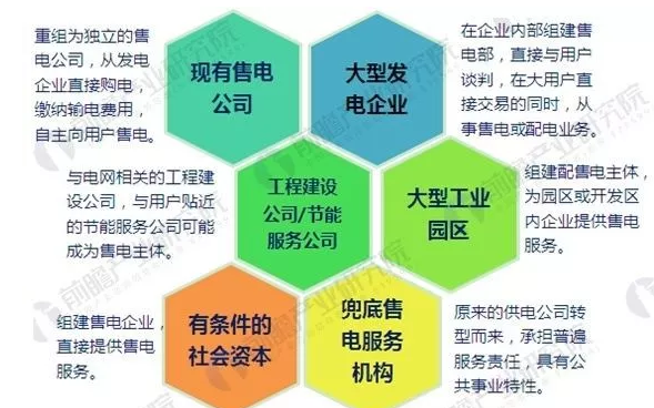 目前,电力市场上所指的售电公司是指新电改之后,中国所出现的各种市场主体类型的售电主体。当前我国从事售电业务的公司主要是电网系企业,电改9号文以及6个重要配套文件中明确提出允许现有供电公司、大型发电公司、工程建设公司/节能服务公司、大型工业园区、有条件的社会资本成立独立售电公司,进入售电侧业务领域。
