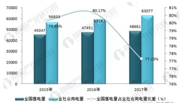 根据电丽统计数据显示,近年来我国社会用电量和售电量呈稳步上升态势。2017年全社会用电量为63077亿瓦时,同比增长6.57%;全国售电量为48661亿瓦时,同比增长2.55%。2017年全国售电企业销售电量占全社会用电量的77.15%。