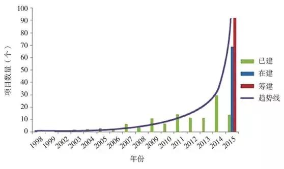 化石能源与能源互联网的结合是目前产业影响比较大的一种商业机会。其中,天然气分布式能源就是国内比较典型的能源互联网发展的新的场景。从时间上来看,天然气分布式能源自1998年开始建设运营,直至2014-2015这两年,开始在建设项目数量上呈现出明显的飞跃。从空间上来看,早期天然气分布式能源主要集中在北上广地区,这几年来,开始逐渐向中西部地区倾斜,二三线城市渗透。在这个发展背景下,工程建设企业、设备制造企业、投资运营商成为了这一市场的主要"玩家"。