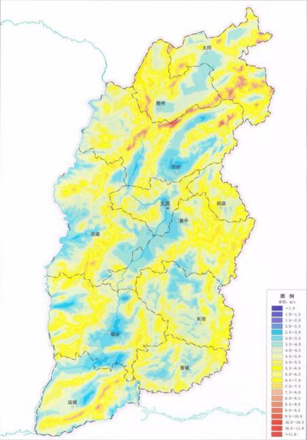 山西省境内地形复杂,地势北高南低,山脉起伏连绵,沟壑纵横,地面气候受到较大影响。山西省风速的分布和地形地势有密切的关系,总体来说,平均风速北部大于南部,山区高于盆地,海拔高的地区大于海拔较低的地区。风速的季节变化也较为明显,由于山西省地形复杂,部分地区受地形和盛行风向的共同作用,季节变化略有不同,但是大部分地区是一致的。春季气旋活动频繁,是山西省风速最大的季节;冬季风速也比较大,仅次于春季,夏季盛行偏南气流,是风速最小的季节。