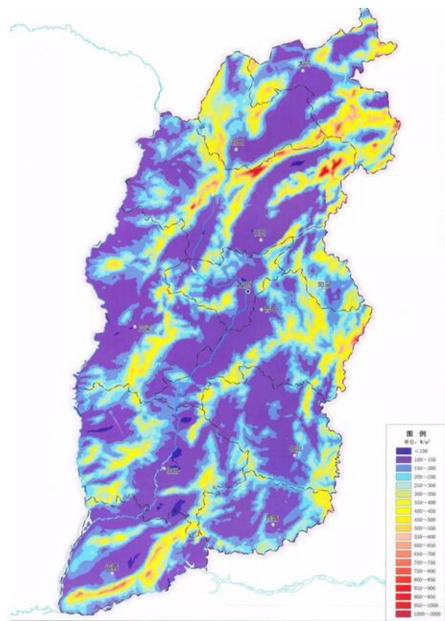 山西省的太阳能资源十分丰富,全省年日照数在2200-3000h之间,年日照百分率为51-67%。其中绝大部分地区全年日照数在2600h以上,有约1/3的地区在2800h以上,属于日照充足的地区。全省年总辐射量介于1350-1650kWh/m2,由于省内地形复杂,年总辐射量的等值线不规则,其分布特点是由南向北逐渐增加,总辐射最高的地方是五台山以北、大同以南的区域,为1650kWh/m2,原平、五寨以北的其他区域次之,为1600kWh/m2,南部的运城最低为1400kWh/m2以下。吕梁市方山县以至左云、右玉一带和五台山及其西北部的繁峙、应县的部分地区,年总辐射量在1630kWh/m2。临汾市部分及晋城市、沁源县在1400-1510kWh/m2之间。运城市大部分1400kWh/m2以下,是山西省太阳辐射的低值区。其余,约占全省60%的地区年总辐射量介于1510-1590kWh/m2之间。山西省开发利用太阳能有相当丰富的资源优势
