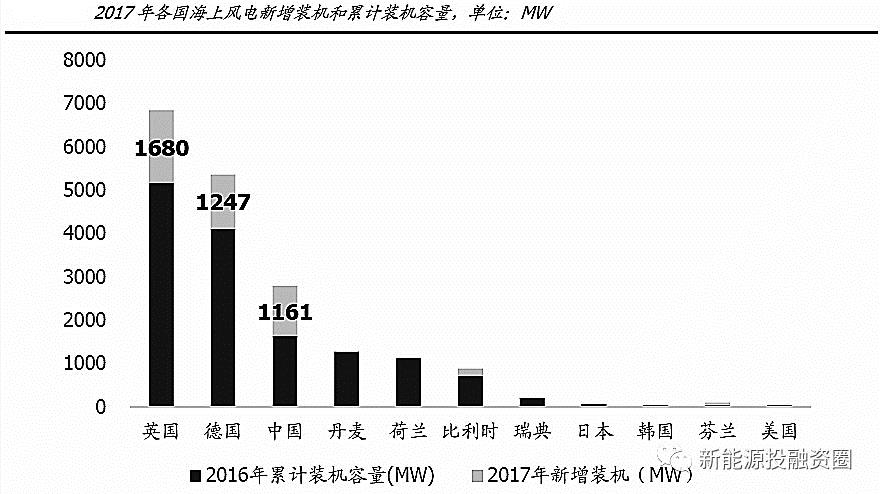 中国海上风电项目的施工速度加快、欧洲市场进一步的成熟发展将成为海上风电主要推动力。根据全球风能协会统计,2017年,欧洲海上风电新增装机容量达到了创纪录的3.148GW,增长率为25%,其中英国新增1.68GW,德国新增1.25GW。目前,欧洲11个国家共拥有4000多台海上风机,总装机容量15.8GW。中国2017年新增装机1.16GW,累计海上风电装机容量2.79GW,同比增速71%。