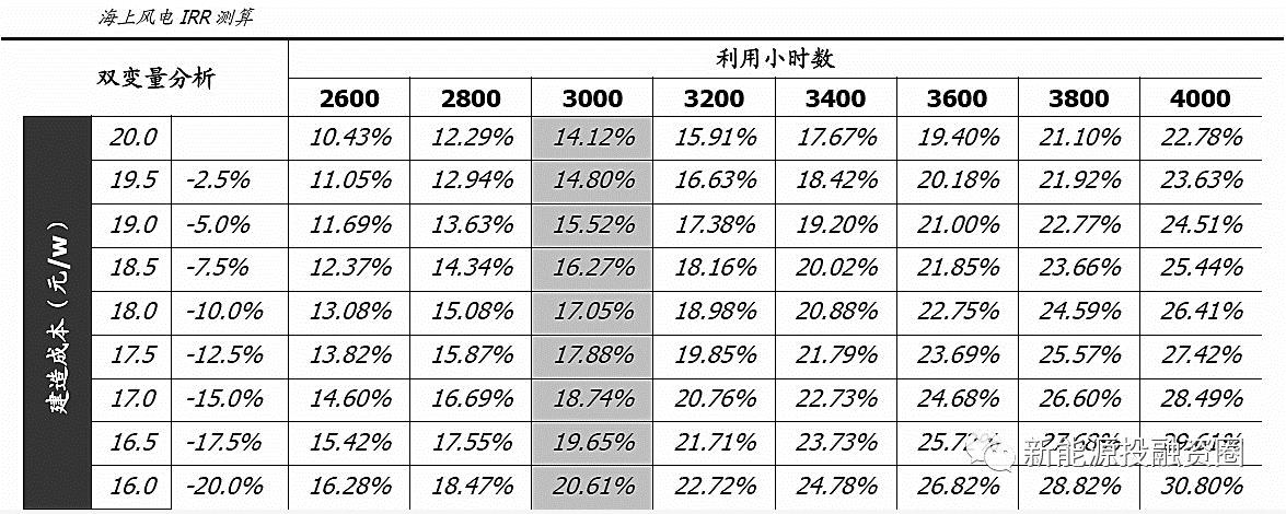 国内风机龙头厂家上海电气、金风、远景都已经推出了大功率的海上风电风机,海上风电的造价也开始出现下降趋势。现在国内海上风电经过这几年发展,已经取得重大突破。金风今年推出了新一代海上大兆瓦产品,名为GW6.X平台及整体解决方案。上海电气更是发布了7MW的海上风机。远景能源也推出了EN-148/4.5MW来应对国内沿海风速低、台风强以及地质复杂的情况,抗台风性能强。在2018年1月30日,江苏龙源如东150MW海上风电场顺利出质保,标志着国内潮间带海上风电大规模开发进入新时期。根据大连汇能集团的数据,海上风电投资成本已经出现明显下滑。其中江苏地区的近海风电场造价已经降至15-18元/w,福建和广州区域的风电场造价在18-20元/w。以3000小时的海上风电利用小时数和0.85元/kWh的电价来估算,造价成本在16-20元/w区间,海上风电场IRR为14%到20.7%之间,远高于陆上风电项目。