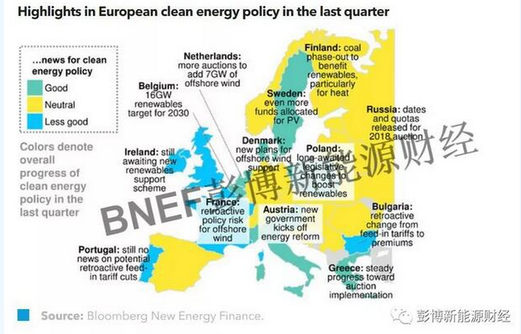 在图中5个蓝色的国家中,有3个国家目前正在考虑追溯性补贴削减。比如,对于2012、2014年拍出的总容量达3GW的海上风电项目,法国政府希望与开发商重新商定上网电价。BNEF预测,双方最终将达成妥协,上网电价将被调低,作为补偿开发商将被允许使用更大的风机。