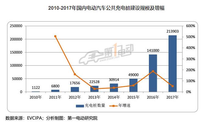 据中国充电联盟统计,截至2017年底,全国充电桩数量达45万个,公共充电设施已基本完成新国标升级,公共充电桩22万个,同比下降51.7%。私人充电桩23万个,同比增长270.6%。公私比例接近1:1,公共设施的增速低于私人的增速。