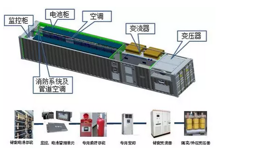 为了保证系统的安全,集装箱内配置了专用的消防及空调系统,其中消防系统通过烟雾传感器、温度传感器、湿度传感器、应急灯等安全设备感知火警,并自动灭火;专用空调系统根据外部环境温度,通过热管理策略控制空调冷热系统,保证集装箱内温度处于合适区间,延长电池使用寿命。