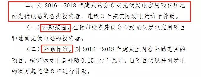 对2016年1月1日至2018年12月31日期间并网的屋顶分布式发电项目,自项目并网次月起,给予投资人0.25元/千瓦时补贴,补贴执行期限15年。