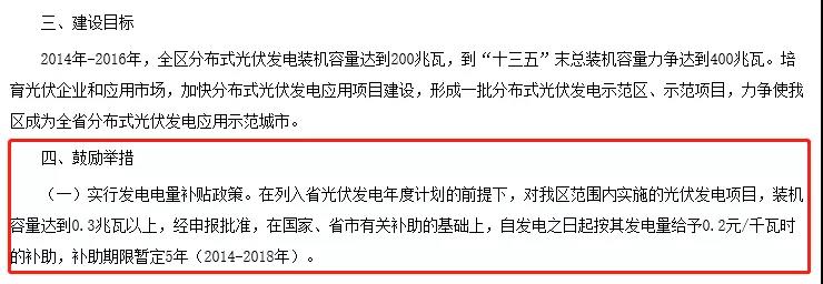 在列入省光伏发电年度计划的前提下,对我区范围内实施的光伏发电项目,装机容量达到0.3兆瓦以上,经申报批准,在国家、省市有关补助的基础上,自发电之日起按其发电量给予0.2元/千瓦时的补助,补助期限暂定5年(2014-2018年)。