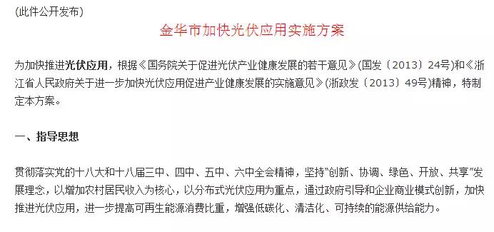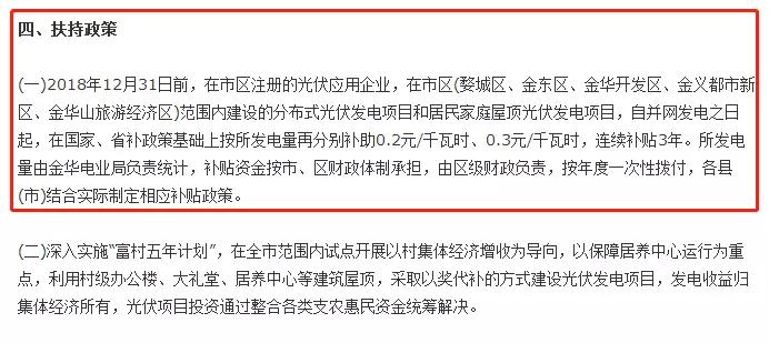 浙江省金华市《金华市加快光伏应用实施方案》,明确2018年12月31日前,在市区注册的光伏应用企业,在市区范围内建设的企业分布式光伏发电项目和居民家庭屋顶光伏发电项目,自并网发电之日起,在国家、省补政策基础上按所发电量再分别补0.2元/千瓦时、0.3元/千瓦时,连续补贴3年。