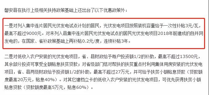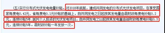 实行分布式光伏发电电量补贴。对2018年底前,建成并网发电的分布式光伏发电项目,在享受国家补贴、省每度电0.1元补贴的基础上,自并网发电之日起按其发电量由县财政每度电补贴0.2元,连续补贴5年;居民个人投资的光伏发电项目,自并网发电之日起按其发电量由县财政每度电补贴0.3元,连续补贴5年。县财政补贴一年发放一次。