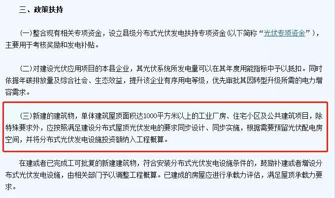新建的建筑物,单体建筑屋顶面积达1000平方米以上的工业厂房、住宅小区及公共建筑项目,除特殊要求外,应按照满足建设分布式屋顶光伏发电的要求同步设计、同步实施,根据需要预留光伏配电房空间,并将分布式光伏发电设施投资额纳入工程概算。