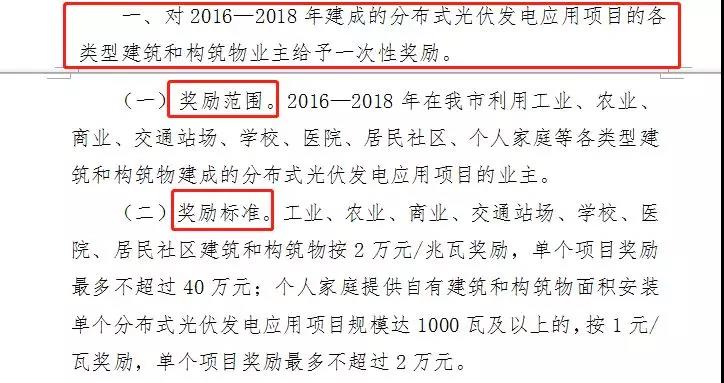 奖励标准:对工业、农业、商业、交通站场、学校、医院、居民社区建筑和构筑物按2万元/兆瓦奖励,单个项目奖励最多不超过40万元;个人家庭提供自有建筑和构筑物面积安装单个分布式光伏发电应用项目规模达1000瓦及以上的,按1元/瓦奖励,单个项目奖励最多不超过2万元。