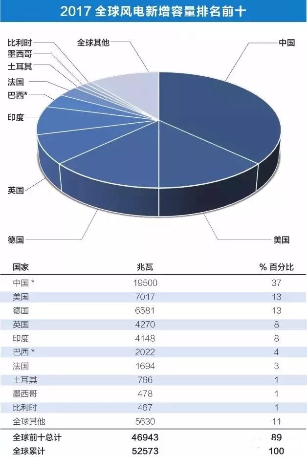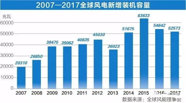 《报告》显示,2017年全球风电市场累计装机容量突破5亿千瓦,新增装机超过50吉瓦。其中,欧洲、印度市场以及海上风电装机实现创纪录突破。