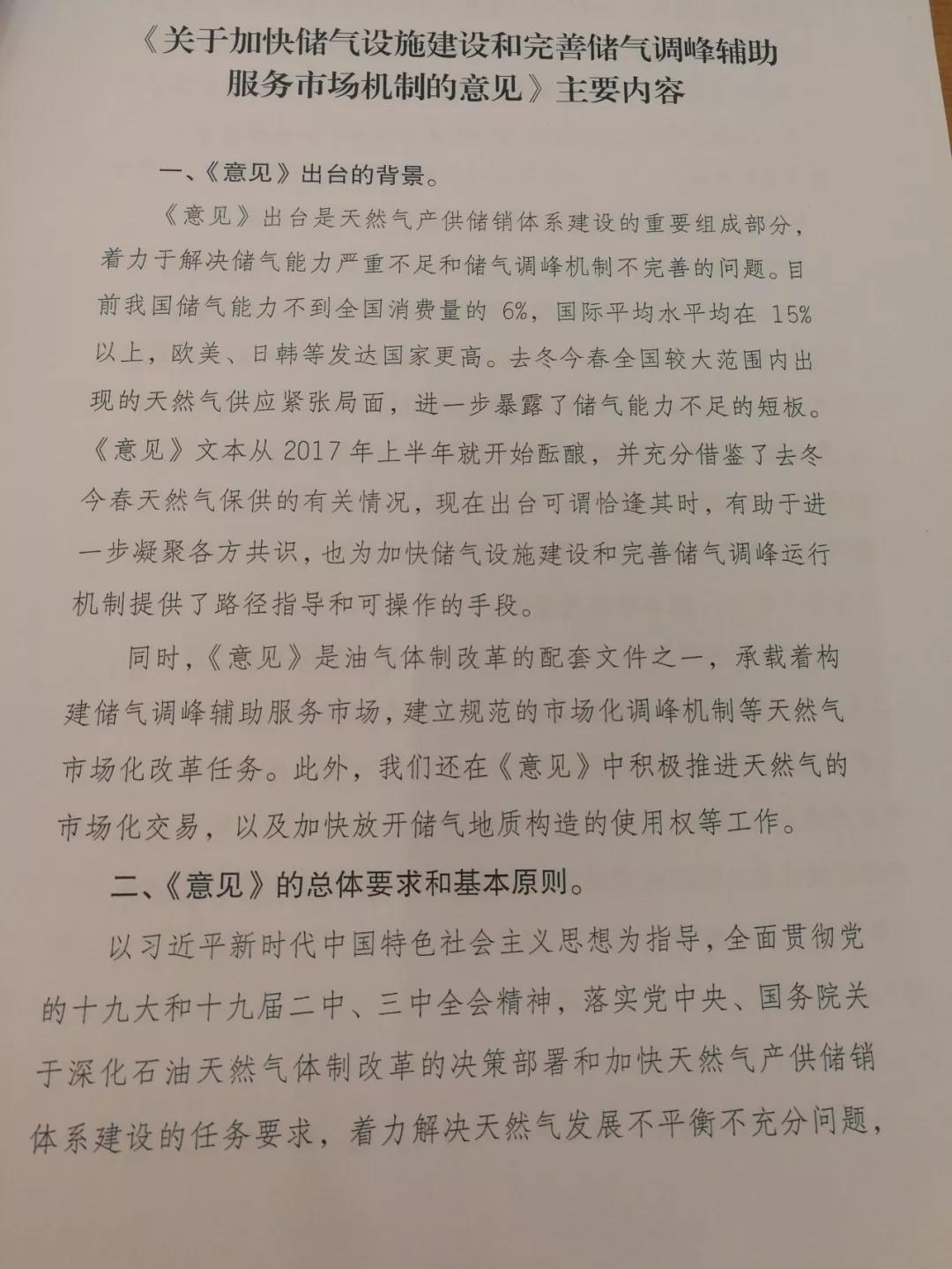 《意见》主要包括两方面内容。一是加快储气设施建设。我们设定了具体明确的储气指标要求,主要是3个数字,即“供气企业10%、城燃企业5%、地方政府3天”。