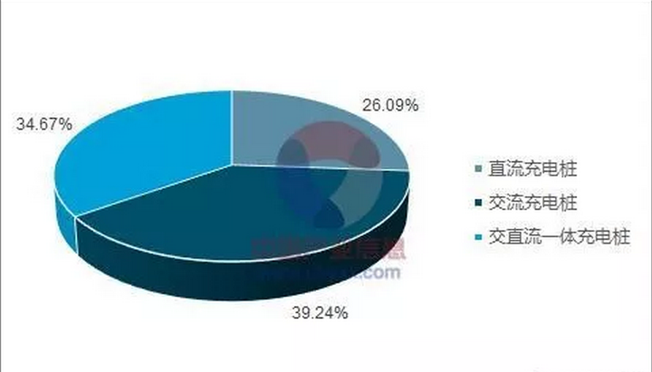 由于直流充电桩的建设成本较高、建设面积较大、不够灵活等多方面多方面因素,市场上目前交流充电桩的占比仍然较高。截止至 2017 年 9月,直流充电桩市场占比为 26%,交直流一体充电桩占比 34.67%,交流充电桩占比近四成。