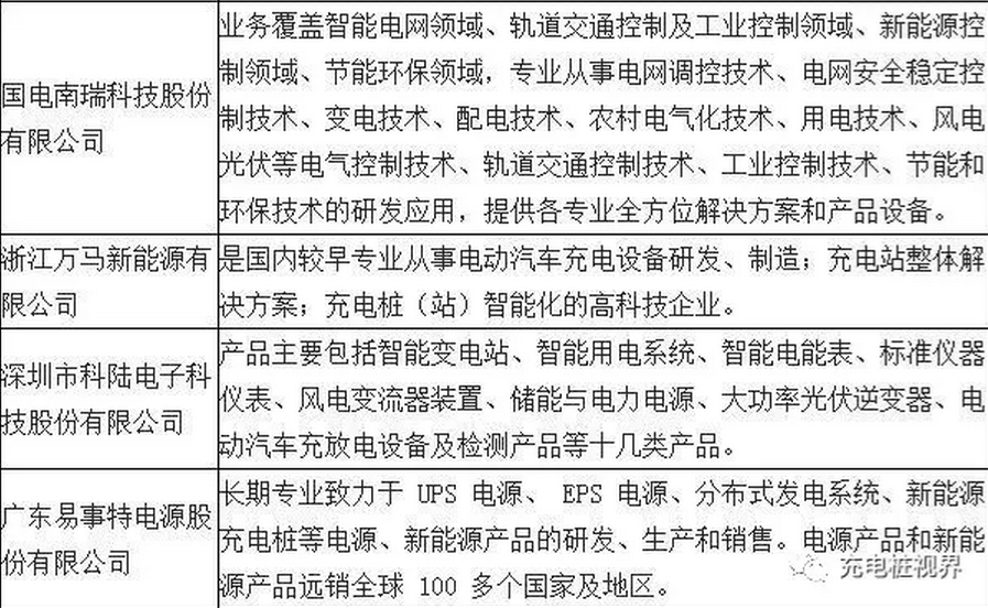 主流设备制造商的产业背景主要是电力电源设备制造、电力供应、电子类产品企业,主流运营服务商的产业背景有充电设备制造商、电力供应商、汽车制造或销售商、互联网企业、 新能源科技公司等。目前,国内较具实力的充电设备制造商包括许继集团、 易事特、 国电南瑞等。