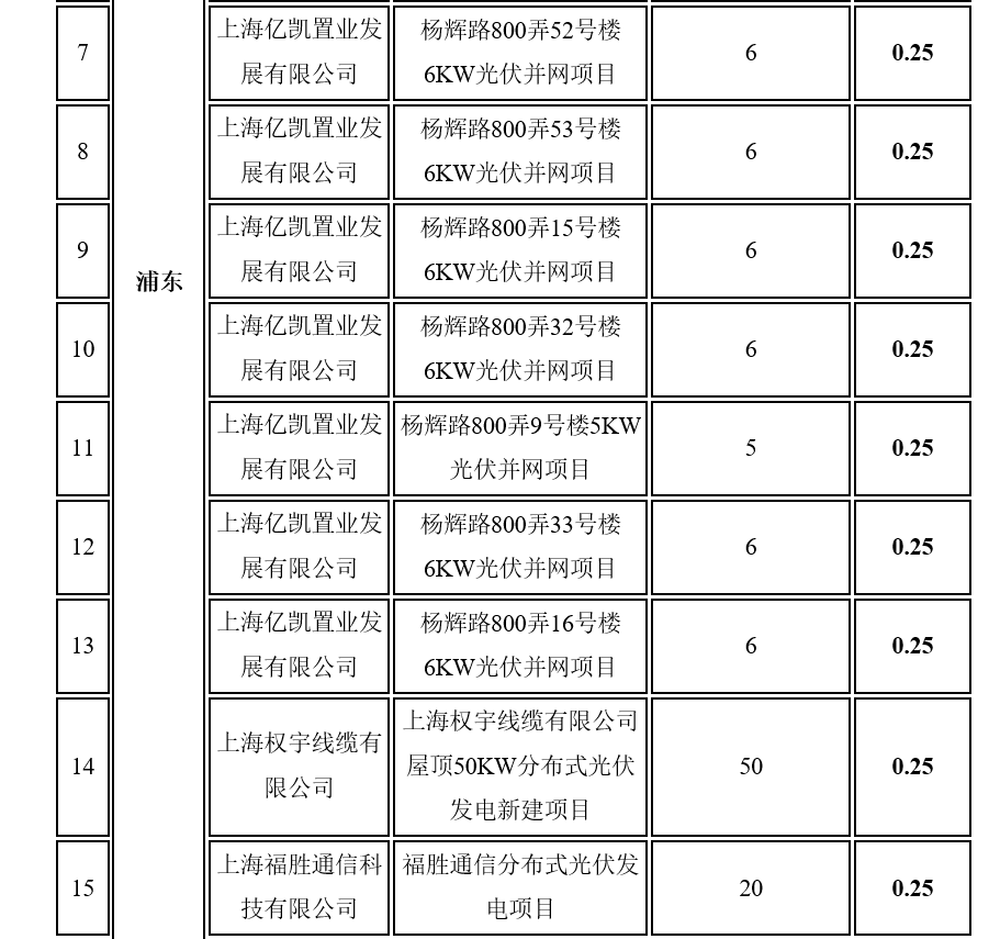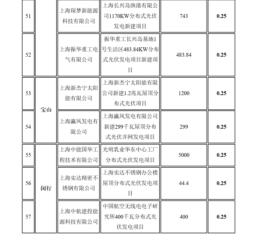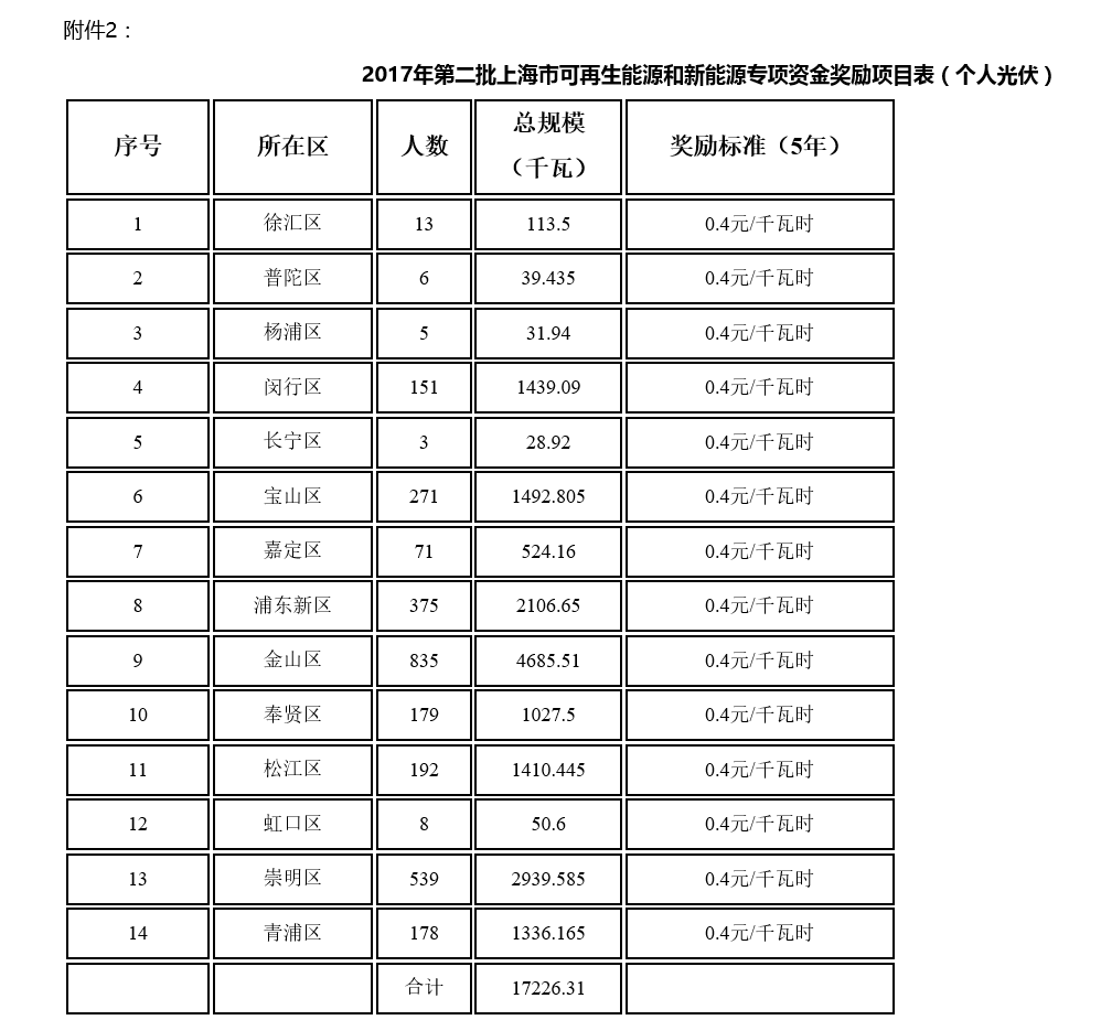 根据《上海市可再生能源和新能源发展专项资金扶持办法》(沪发改能源〔2016〕136号),市发展改革委会同相关部门和单位,组织开展了2017年第三批可再生能源和新能源发展专项资金扶持项目的申报和评审工作。在专家评审意见的基础上,经审核,上海熙熙日用品商店分布式光伏发电项目等61个光伏项目(共27122.11千瓦)和2826户个人光伏(共17226.31千瓦)符合条件,列入市可再生能源和新能源发展专项资金奖励目录予以支持(详见附件)。项目奖励电量的起始时间以并网时间为准(从0开始计量)。