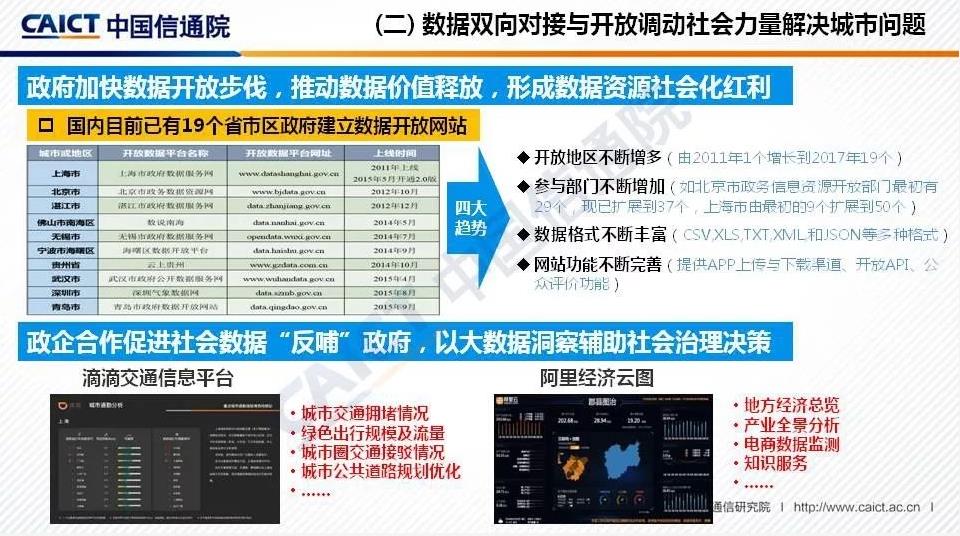 二是在政务资源共享的基础上,数据双向对接,释放数据价值的意义愈发重要。数据双向对接主要表现在两方面:一方面政府加快数据开放步伐,推动数据价值释放;另一方面社会数据“反哺”政府,大量企业以大数据洞察辅助社会治理决策,共同为实现城市精细化管理提供数据支撑