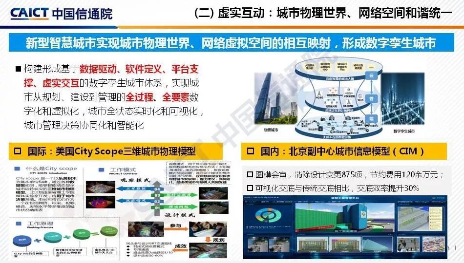 二是虚实融合,新型智慧城市在网络空间再造一个与城市物理世界相匹配、一一对应的“孪生城市”。