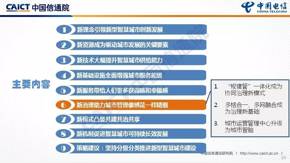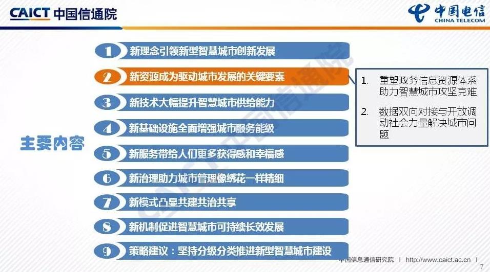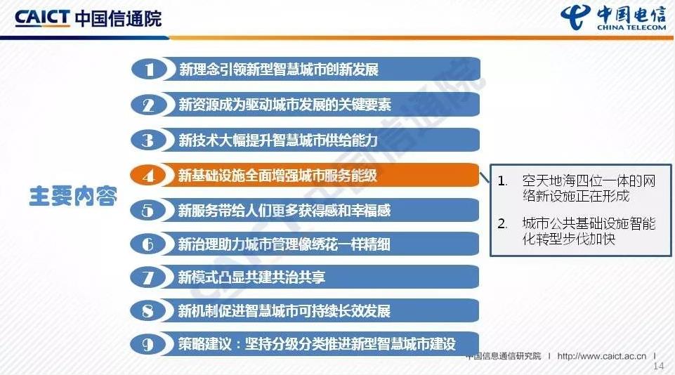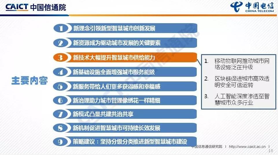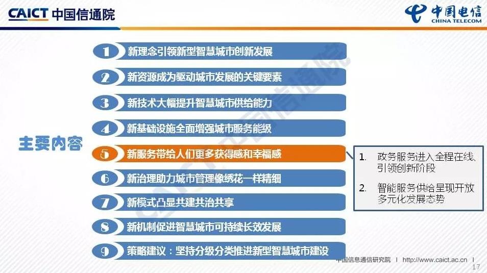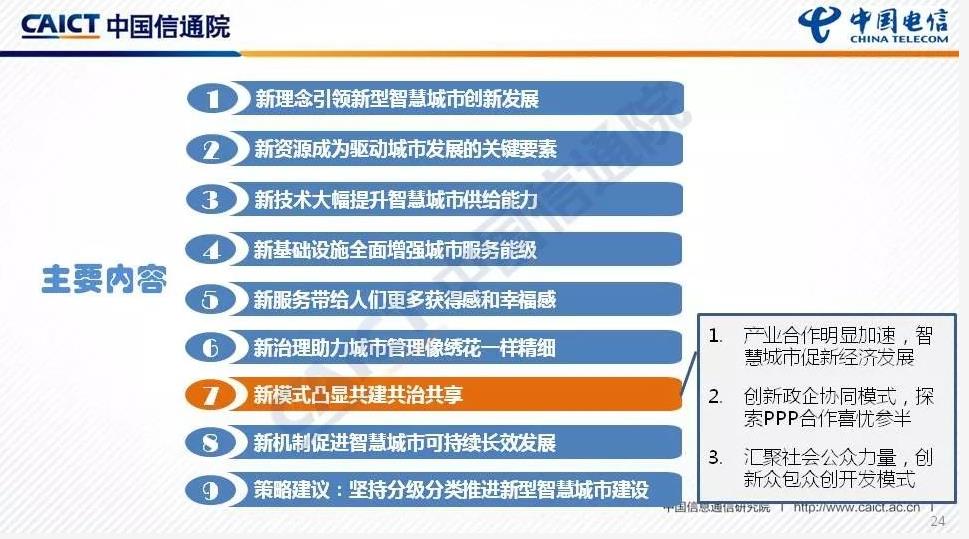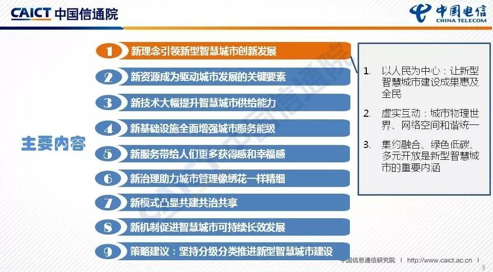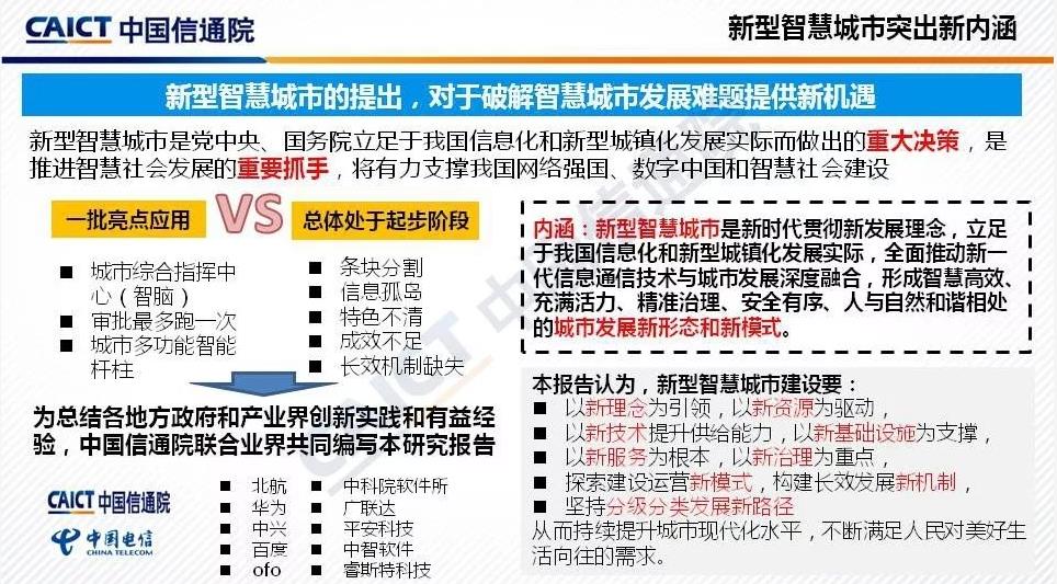 为总结各地方政府和产业界的创新实践和有益经验,中国信息通信研究院与中国电信集团公司合作,联合北京航空航天大学、华为技术有限公司、中兴通讯股份有限公司、中智软件、中国科学院软件研究所、广联达科技股份有限公司、百度、ofo小黄车、平安科技、睿思特科技等智慧城市建设运营参与方,共同编写了《新理念新模式新动能——新型智慧城市发展与实践研究报告》,研究并提出新型智慧城市建设的特征、进展和趋势,凸显以新理念为引领,以新要素为驱动,以新技术为抓手,以新设施为支撑,以新服务为根本,以新治理为重点,以新模式为亮点,以新机制为动力,以新路径为特色,从而为各级政府制定相关政策规划提供帮助,为产业界深入探索智慧城市新模式和新业态提供借鉴。