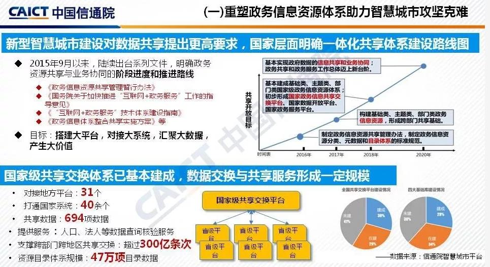 一是对政府部门内部而言,重塑政务信息资源体系,将有效助力智慧城市解决政务资源共享与业务协同的痛点问题。目前,国家层面明确一体化共享体系建设路线图,引导地方全面加强政务信息系统和数据资源整合共享。国家层面,国家级共享交换体系已基本建成;地方层面,已经有60%左右城市开始建设共享交换平台和基础数据库。