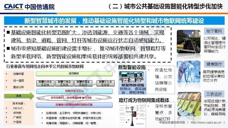 二是城市公共基础设施智能化转型步伐也在加快。基础设施智能化转型范围扩大,渗透到能源、交通等各个领域,实现建筑、桥梁、道路、管网、灯杆等城市设施运行状态自动感知能力。城市级感知基础设施的建设需求增长,推动城市物联网、智慧路灯等新型承载网络、新型智能设施和集成载体的统筹部署和共建共享。