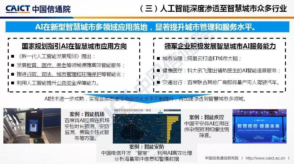 三是人工智能深度渗透至智慧城市众多行业。人工智能深入渗透到城市治理、健康医疗、交通出行等领域,显著提升城市管理和服务水平。