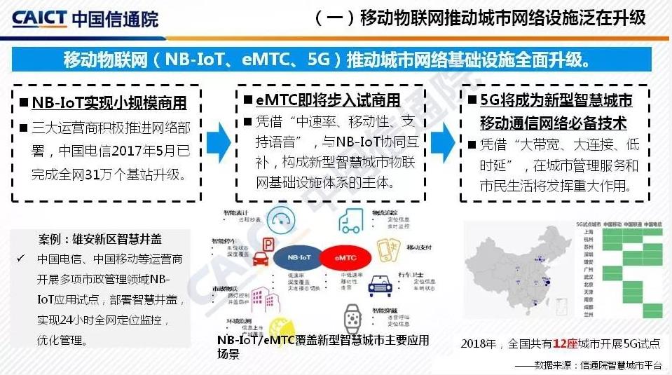 一是移动物联网推动城市网络设施泛在升级。由窄带物联网(NB-IoT)、增强性机器通信技术(eMTC)、第五代移动通信技术(5G)三种技术共同构成的移动物联网,正成为增强城市运行状态感知能力、提高城市管理和民生服务效率的重要手段。