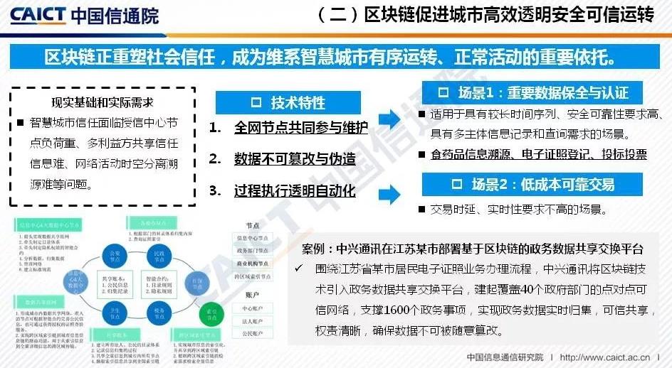 二是区块链促进城市高效透明安全可信运转。智慧城市信任面临授信中心节点负荷重、多利益方共享信任信息难等问题,区块链正重塑社会信任,成为维系智慧城市有序运转、正常活动的重要依托。