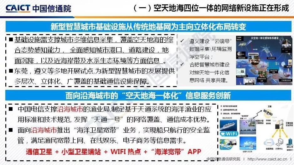 一是空天地海四位一体的网络新设施正在形成。新型智慧城市基础设施正从以传统地基网为主向立体化布局转变,基础设施需支撑城市多维信息采集,覆盖空天地海的综合态势感知能力。面向沿海城市的“空天地海一体化”信息服务也在进行创新,包含制定标准和技术规范,推出信息服务。
