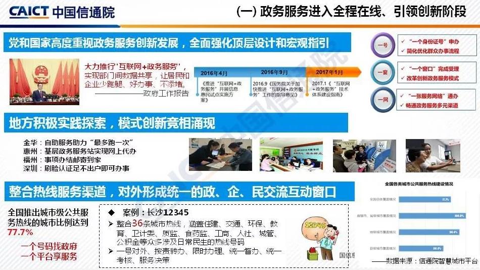 一是政务服务正在进入全程在线、引领创新阶段。国家层面高度重视政务服务创新发展,全面强化了顶层设计和宏观指引。地方积极实践探索,“最多跑一次”等模式创新竞相涌现。服务热线的整合简化,对外形成统一的政、企、民交流互动窗口,目前全国推出城市级公共服务热线的城市比例达到77.7%,直辖市、省级城市覆盖达100%。