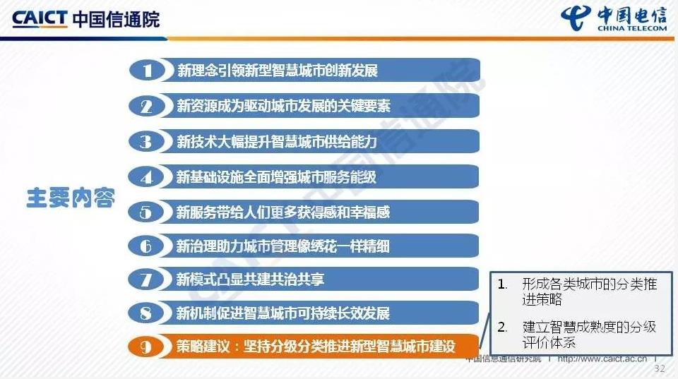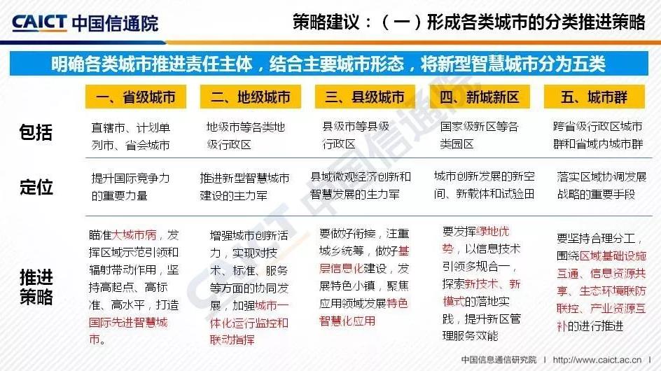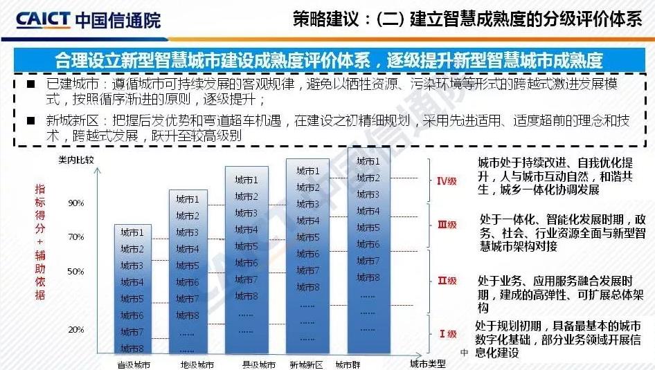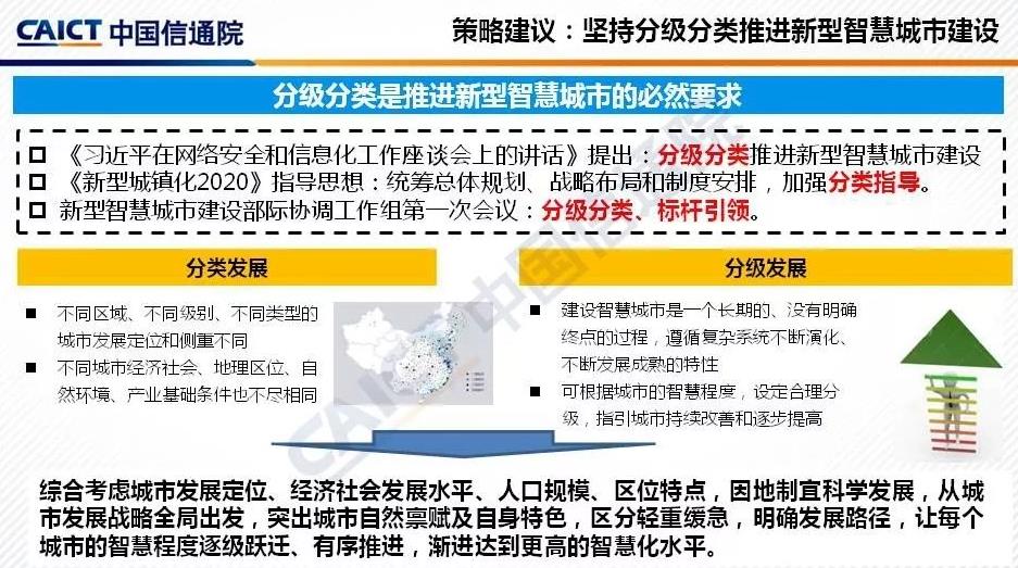 分级分类是推进新型智慧城市的必然要求。分级分类是必然要求:习总书曾记提出分级分类推进新型智慧城市建设的理念。《国家新型城镇化规划(2014―2020年)》报告中指出分类指导。新型智慧城市建设部际协调工作组第一次会议上提出:分级分类、标杆引领。分类发展方面,由于不同区域、不同级别、不同类型的城市发展定位和侧重不同,要因地制宜科学发展,从城市发展战略全局出发,突出城市自然禀赋及自身特色;分级发展方面,建设智慧城市是一个长期的、没有明确终点的过程,遵循复杂系统不断演化、不断发展成熟的特性,可设定合理分级,指引城市持续改善和逐步提高。