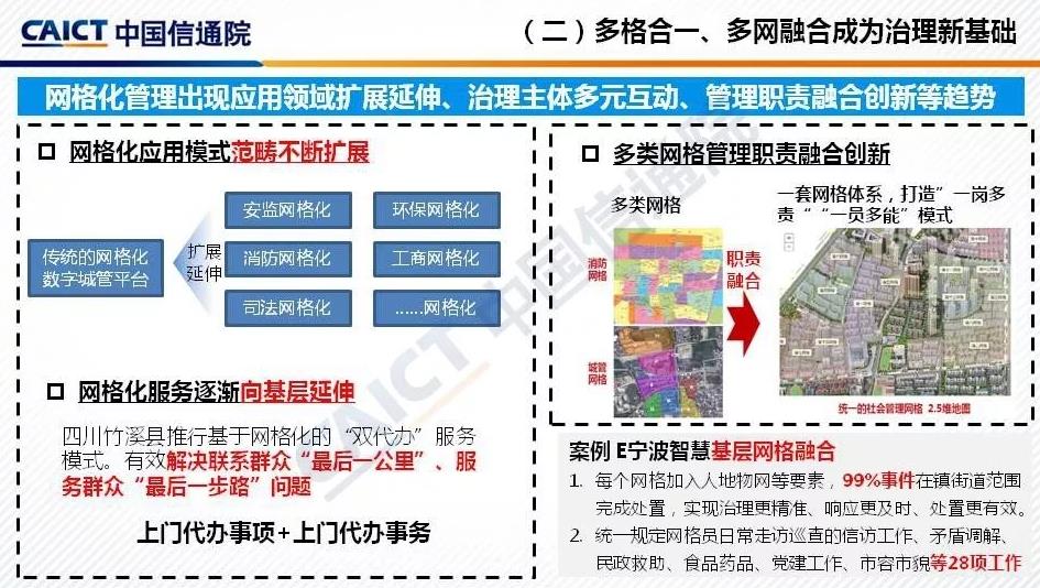 二是多格合一、多网融合成为治理新基础。网格化管理出现应用领域扩展延伸、治理主体多元互动、管理职责融合创新等趋势。