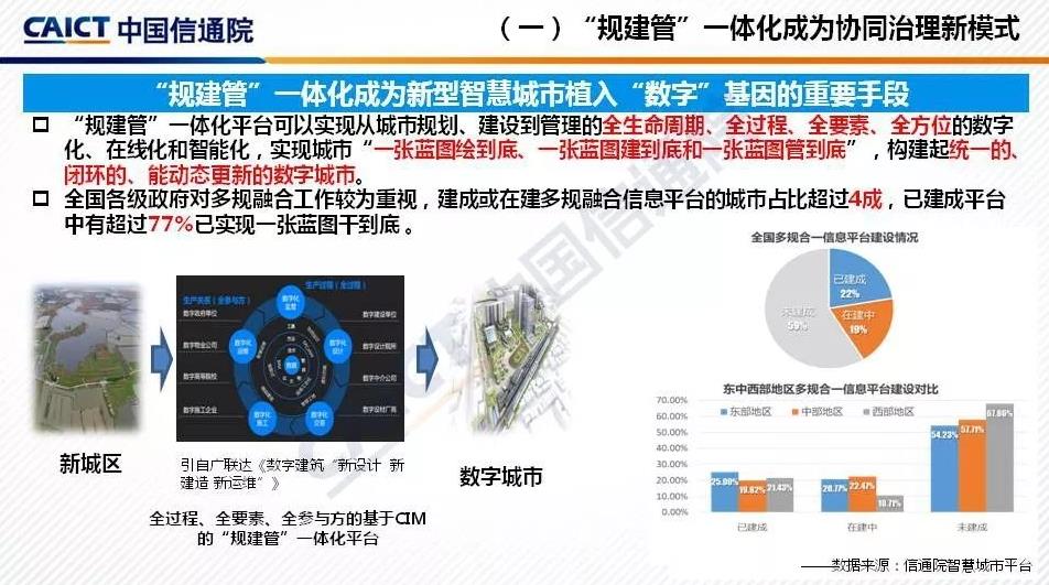 一是“规建管”一体化成为协同治理新模式。“规建管”一体化平台可以实现从城市规划、建设到管理的全生命周期、全过程、全要素、全方位的数字化、在线化和智能化,实现城市“一张蓝图绘到底、一张蓝图建到底和一张蓝图管到底”,目前建成或在建多规融合信息平台的城市占比超过4成。