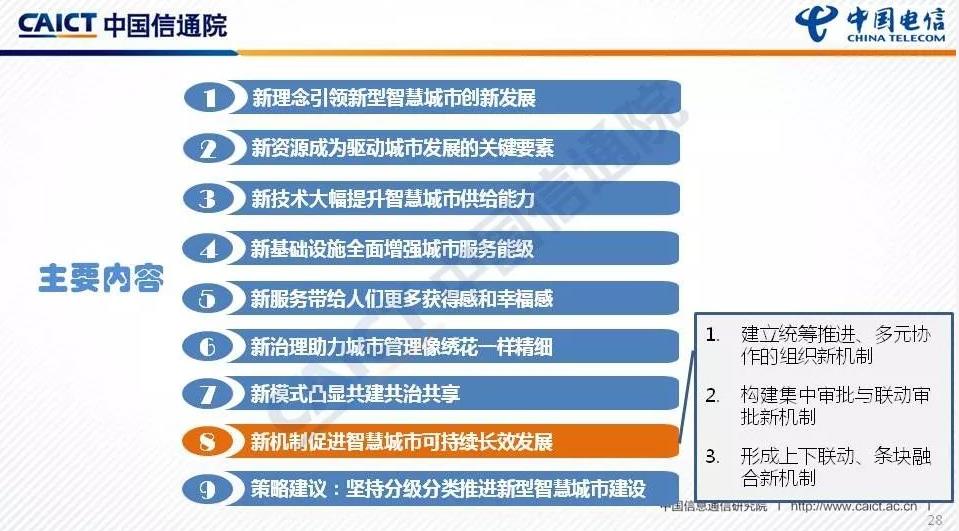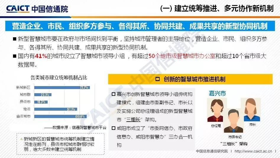 一是组织机制。建立以政府为主导统筹,企业、市民、组织等多元协作新机制,目前已有41%的城市成立智慧城市领导小组,新城新区智慧城市统筹机制建设走在最前列。