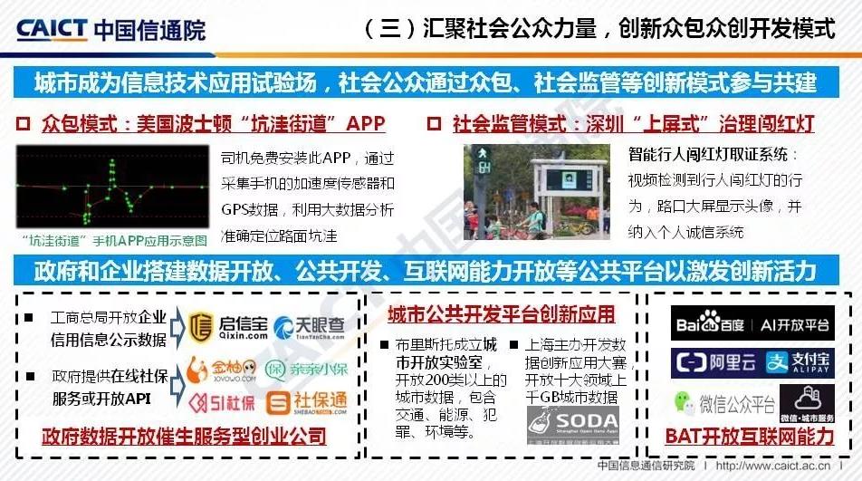 三是汇聚社会公众力量,创新众包众创开发模式。汇聚社会公众力量、采取众包、社会监管等模式参与共建,政府和企业共建数据开放、公共开发、互联网能力开发等平台以激发公众创新活力。