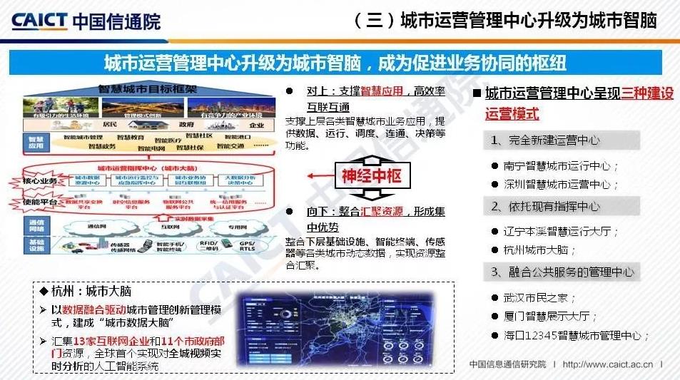 三是城市运营管理中心升级为城市智脑。城市综合运营管理中心以信息展示、实时监测、决策分析、事件管理为主要功能,是支撑城市运营管理的神经中枢。城市运营管理中心在推进建设中有三种主要模式:一是完全新建运营中心;二是依托交通、城管等已有指挥中心;三是面向公共服务或展示中心。