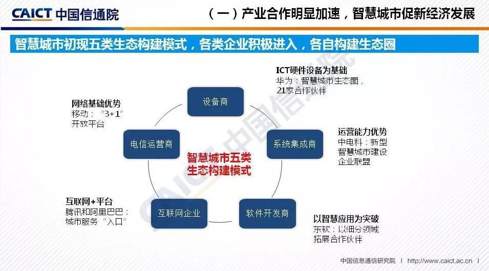 一是产业合作明显加速,智慧城市促新经济发展。目前已出现五类智慧城市生态构建模式,包括设备商、电信运营商、系统集成商、互联网企业以及软件开发商,已构建各自的生态圈。