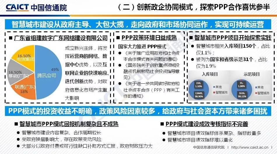 二是创新政企协同模式,探索PPP合作喜忧参半。智慧城市建设模式由政府主导、大包大揽转变为政府和市场协作、可持续运营模式,开始探索PPP合作模式,虽有成效,但仍存在投资收益不明确、政策风险因素较多等问题;