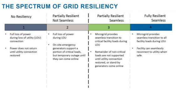 图中所示的微电网弹性范围从没有弹性到完全具有弹性,并且可以实现从连接到电网的实际无缝过渡。没有部署微电网的客户(例如住宅用户)在电网中断期间将会完全中断。一旦电力公司诊断并解决了电网中断或故障,其电力才会恢复正常。