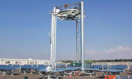 该项目由33套联动的定日镜组成光场系统,集热塔是一种特殊的二次反射塔,塔顶安装二次反射镜,将太阳能二次反射至置于地面的热量接收装置,与传统的塔式热发电的热量接收器的位置完全不同。
