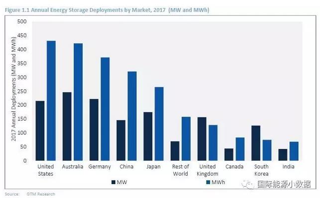 根据GTMResearch日前发布全球储能报告,2017年全球新增储能容量1.4吉瓦、电量230万千瓦时。从容量的角度来看,澳大利亚新增246兆瓦,居全球首位;从电量的角度看,美国新增43.1万千瓦时,居全球首位。2017年中国的新增储能容量约为150吉瓦/32万千瓦时。