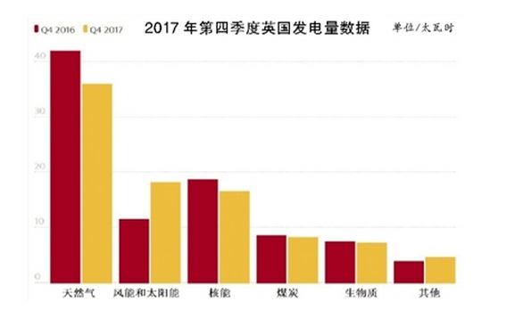 更重要的是,根据英国商业、能源和工业战略部的最新数据,2017年第四季度,得益于高风速、新的可再生能源装置的投用,风能和太阳能首次超过核能成为英国第二大电源。具体来看,风能和太阳能发电量为18.33太瓦时,而核能发电量为16.69太瓦时。