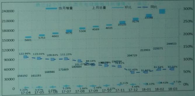 就公共充电桩来说,其中交流充电桩109584个、直流充电桩77437个、交直流一体充电桩66053个。2018年3月较2018年2月新增公共类充电桩9051个。从2017年4月到2018年3月,月均新增公共类充电桩约8074个,2018年3月同比增长62.0%。实际每月新增公共类充电设施及环比数据如下图所示: