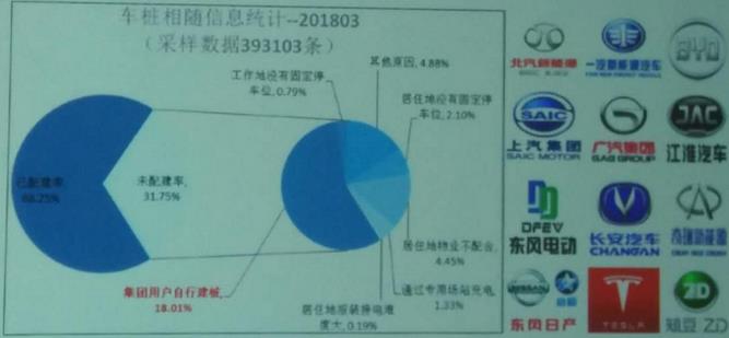 截至2018年3月,通过联盟内成员整车企业(比亚迪、上汽、北汽、江淮、特斯拉、长安、吉利、奇瑞、东风电动、东风日产、广汽、一汽、知豆)采样车桩相随信息数据393103条,其中建设安装私人类充电桩268282个,整体未配建率约31.8%,其中约18%是由于集团用户采购纯电动轿车作为出租车、分时租赁用车等运营专用车辆而不需要车企随车配建充电设施所致。另一方面,因私购车的充电桩配建约为83.2%。