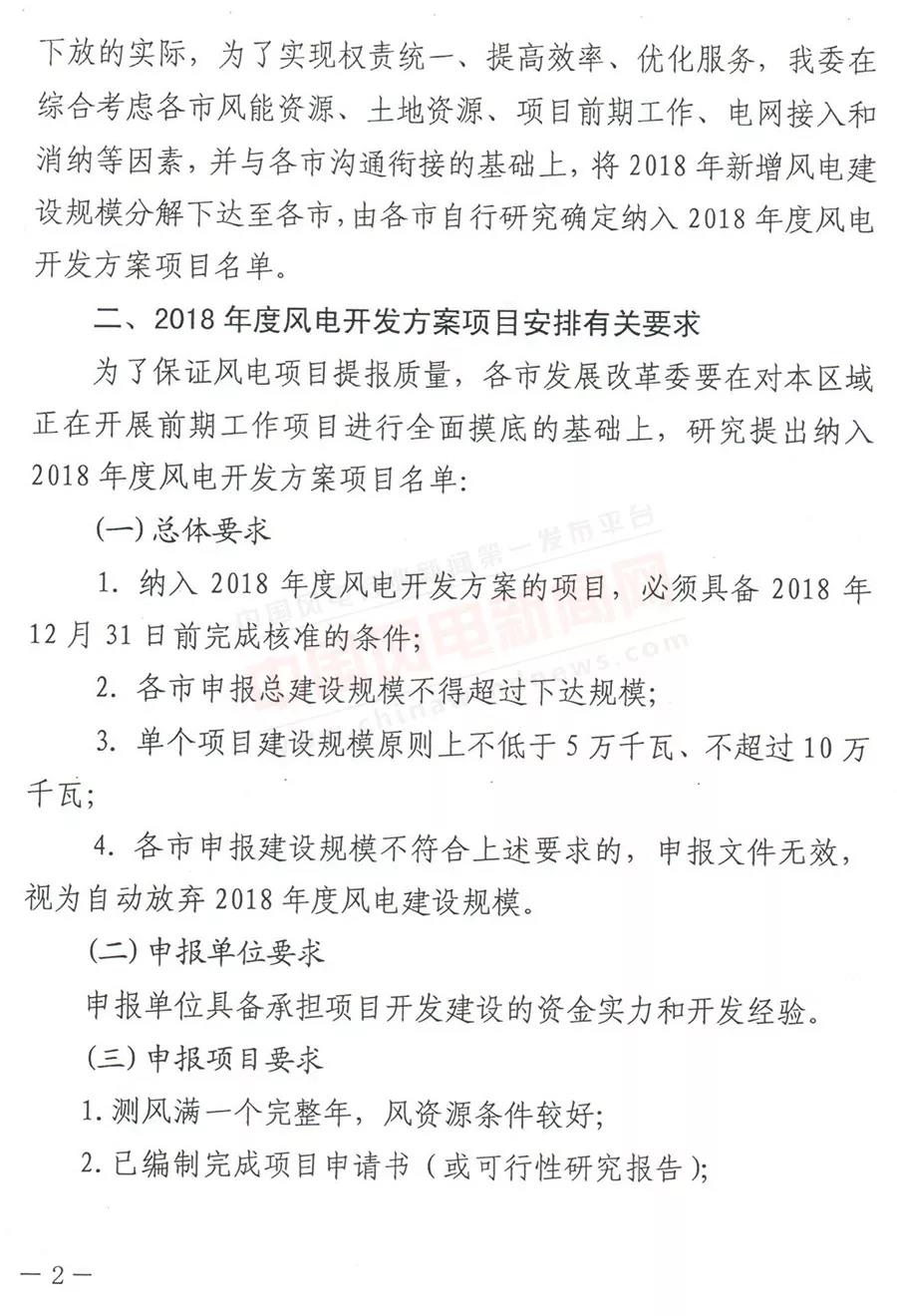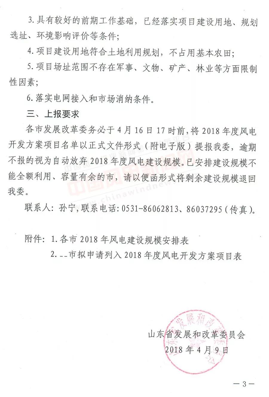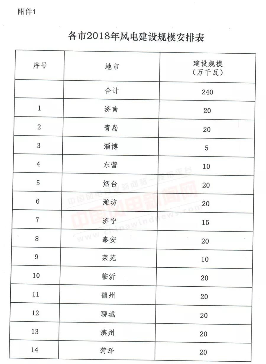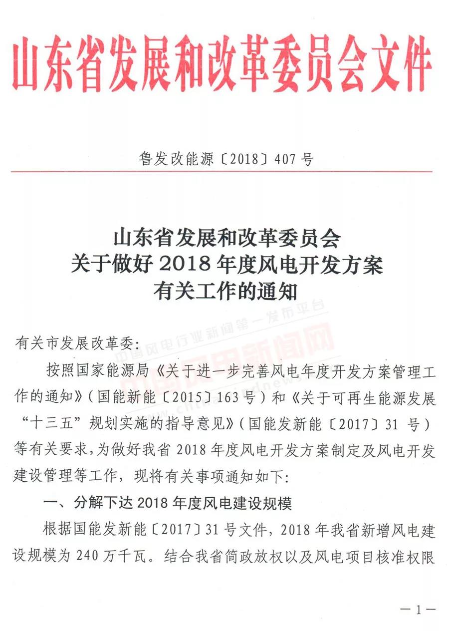 山东省发改委9号下发关于做好2018年度风电开发方案有关工作的通知,通知要求:根据国能发新能〔2017〕31号文件,山东省2018年新增风电建设规模为240万千瓦,申请纳入2018年度风电开发方案的项目,必须具备2018年12月31日前完成核准的条件。