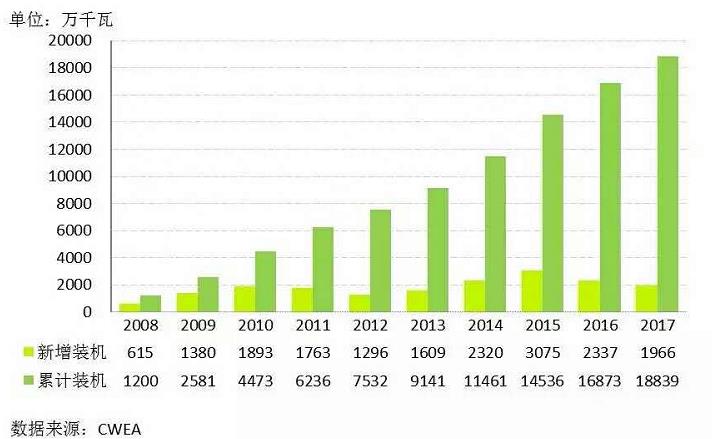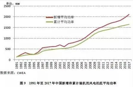 2017年,中国新增装机的风电机组平均功率2.1MW,同比增长8%;截至2017年底,累计装机的风电机组平均功率为1.7MW,同比增长2.6%。