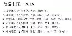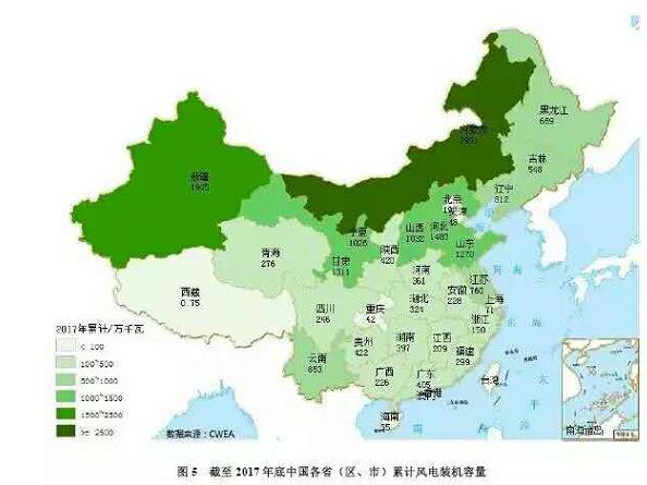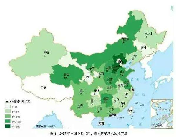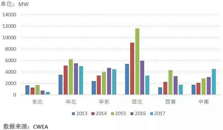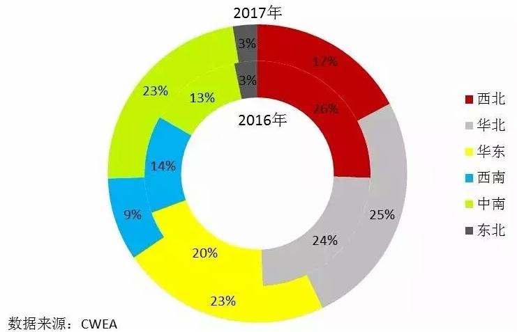 2017年,中国六大区域的风电新增装机容量所占比例分别为华北(25%)、中南(23%)、华东(23%)、西北(17%)、西南(9%)、东北(3%)。“三北”地区新增装机容量占比为45%,中东南部地区新增装机容量占比达到55%。