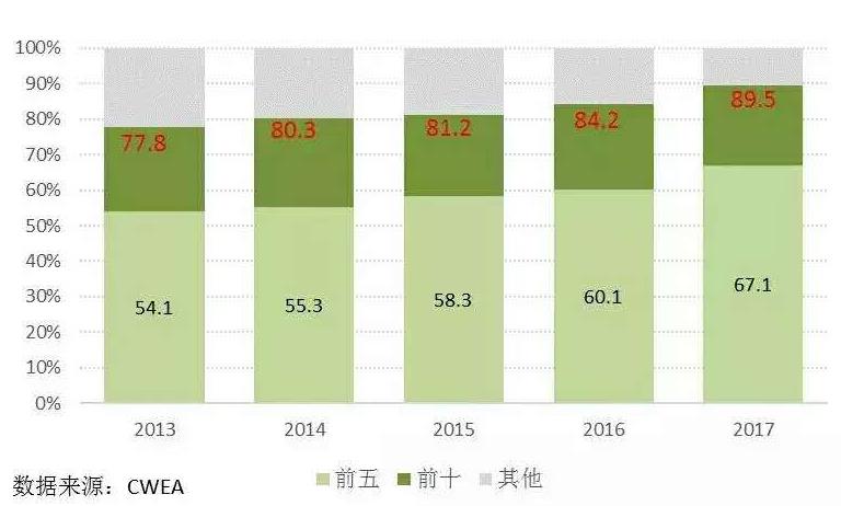 近5年,风电整机制造企业的市场份额集中趋势明显。排名前五的风电机组制造企业新增装机市场份额由2013年的54.1%增长到2017年的67.1%,增长了13%;排名前十的风电制造企业新增装机市场份额由2013年的77.8%增长到2017年的77.8%增长到2017年的89.5%,增长了12%。