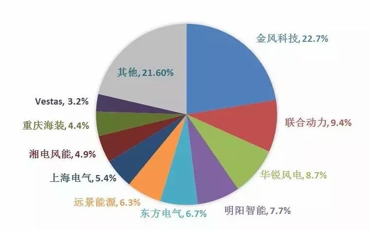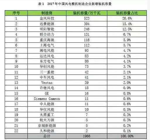 2017年,中国风电统计有新增装机的整机制造企业共22家,新增装机容量1966万千瓦,备受业界关注的前十位分别为:金风科技、远景能源、明阳智能、联合动力、中国海装、上海电气、湘电风能、运达风电、东方 电气、华创风能。